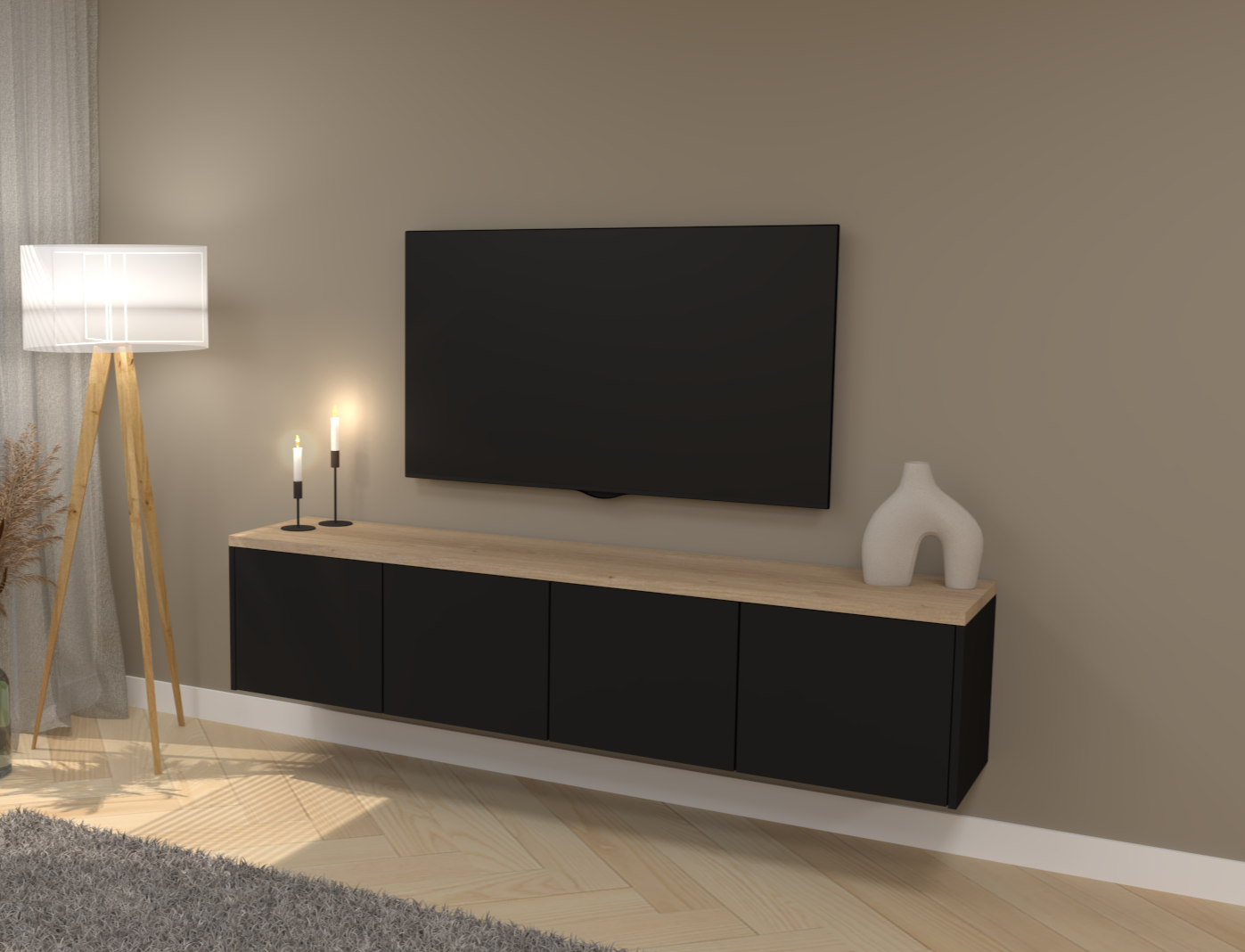 Standaard wordt dit wandmeubel gemaakt met deurtjes en een gesloten achterwand. Heb je liever met klep, open vak of hier een combinatie van? Of een open achterwand zodat de bekabeling makkelijker is door te voeren? Dit wordt in het bestel proces als opties weergegeven.
